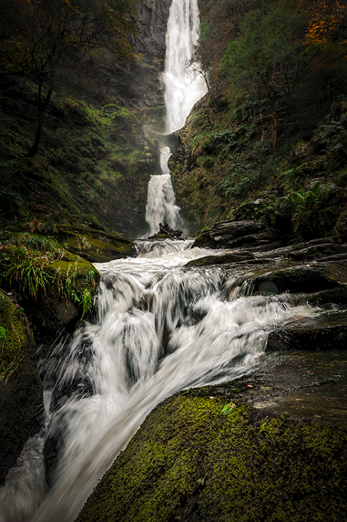 Fast flowing water at Pistyll Rhaeadr in North Wales.