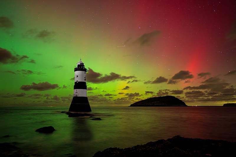 Magical colours of the Northern Lights at Trwyn Du lighthouse in Penmon, Anglesey.